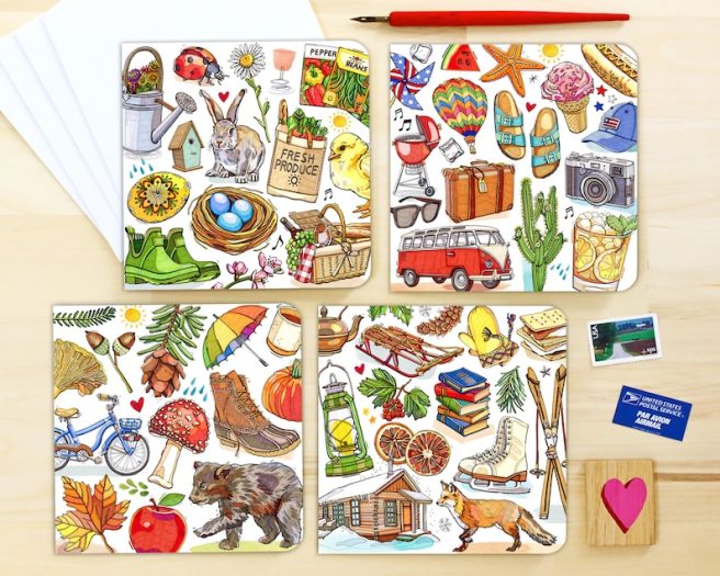 Louise Neumann is the illustrator/professional doodler behind this delightful Etsy shop, where you can find fun and delightful notecards, postcards, prints, notebooks and calendars in a variety of themes: nature, four seasons, food & drink, 50 states, school, and gardening.