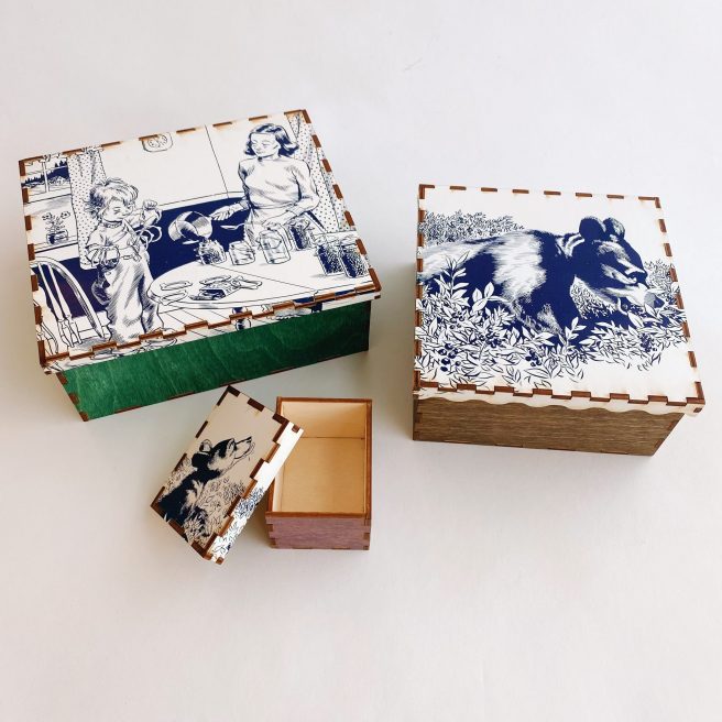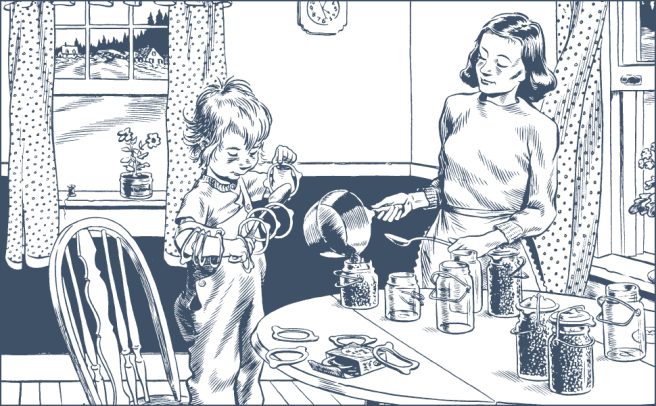 But the endpapers? A nostalgic kitchen scene that beautifully depicts the heart of the home. Did you know the wood stove actually belonged to McCloskey’s mother-in-law Ruth Sawyer (herself an esteemed children’s book author)? From the polka dot curtains to the tiny kitten to the vintage egg beater in the drawer to the rubber canning seals on Sal’s arm — this is a picture for the ages.