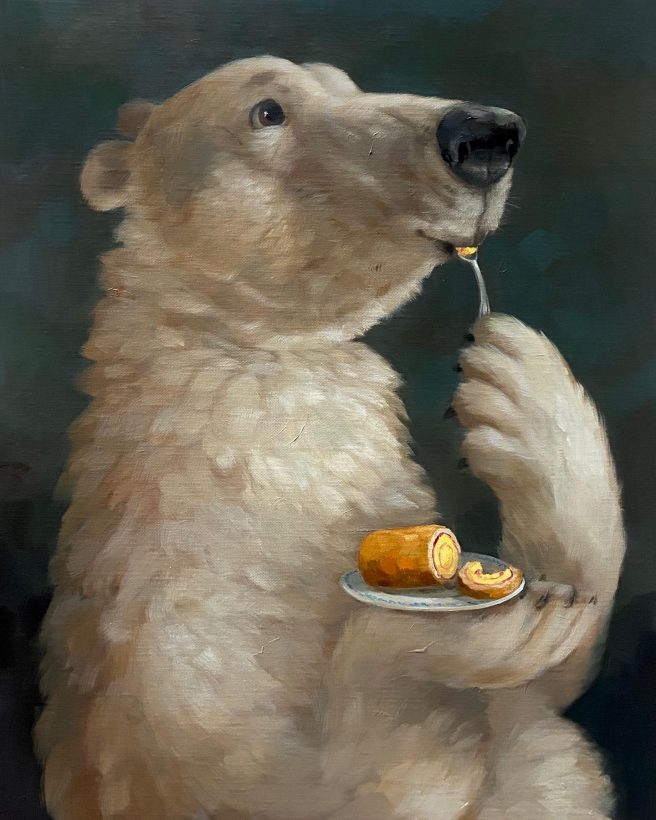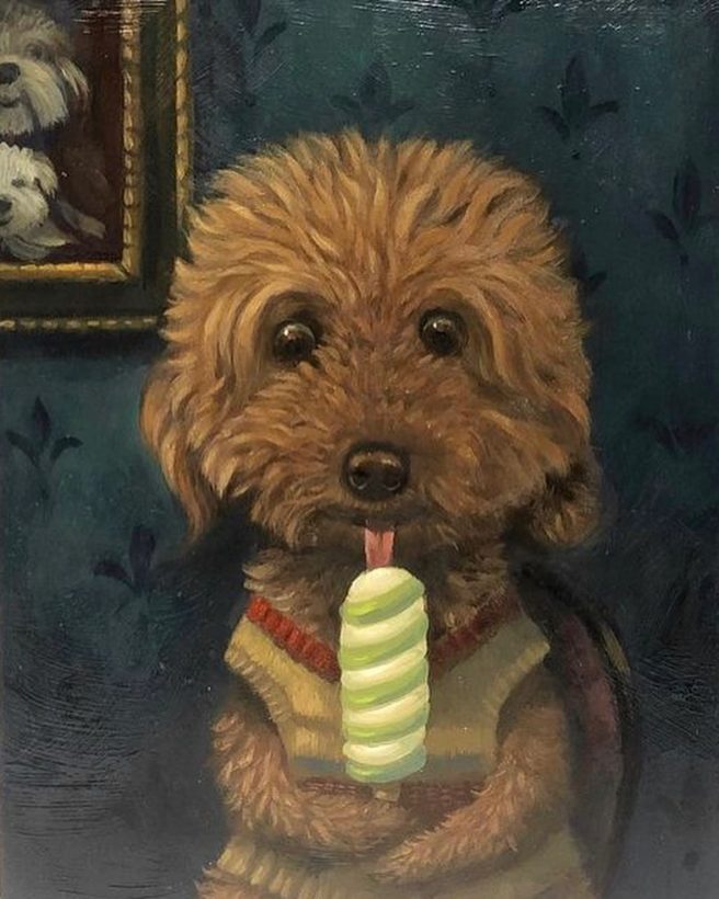Need I mention how much I love that food is also featured in her pictures? Yes, she does some portraits showing animals posing with other objects, but the majority seems to include sweet treats. Ice cream, lollipops and cookies add a bit of nostalgia, triggering pleasant childhood memories. Working in oil on linen canvas or panel, she’s given us a delightful glimpse into animals’ secret lives.