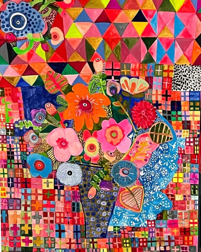 After living in New York for about a decade, Sharon moved back to California, where she enjoys the sunshine, tacos, plentiful flowers and her beautiful coastal town. She paints and draws every day (watercolor, gouache, acrylic, collage) and takes her sketchbook with her everywhere. I was immediately drawn to the fine details, whimsy, and joyful energy in her pieces.