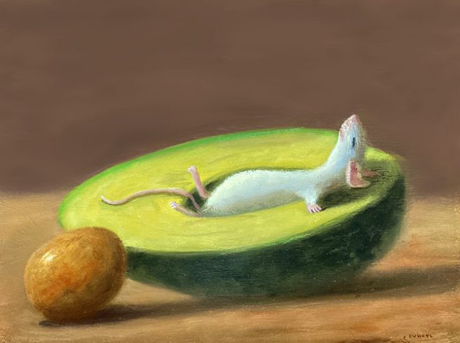 Stuart’s work is collected by enthusiasts across the country. He calls his mice paintings “a magnificent obsession.” Just one mouse with one object, but a lot of story to tell. What else does he like to paint besides mice? Giant fruit tarts. My kind of artist. 🙂