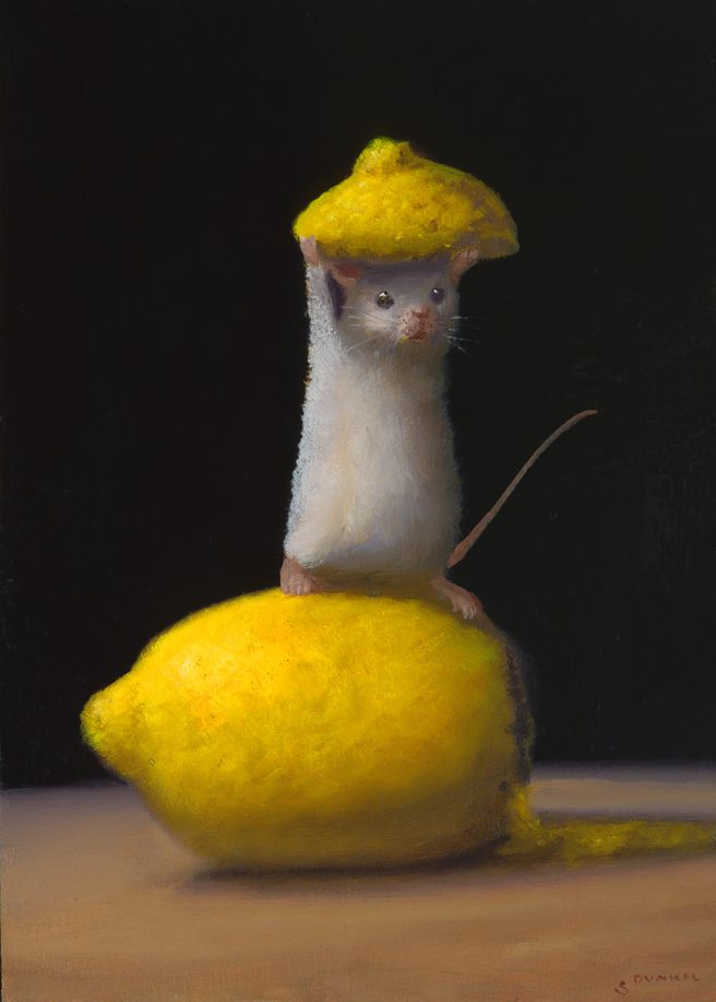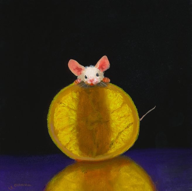 He considers his paintings autobiographical, as he tries to channel the mouse’s emotions. His realistic paintings are inspired by the Dutch masters with a unique touch of whimsy and subtle humor. They reflect his personality, which he describes as mischievous and a bit goofy.