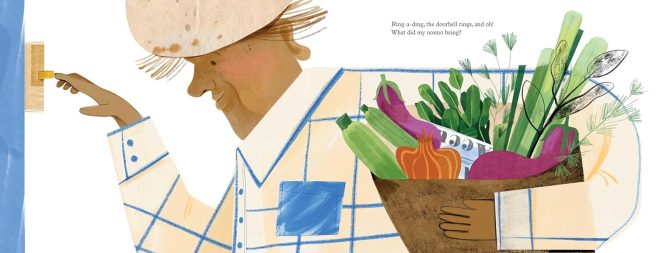 The next minute, the doorbell rings again. Nonno Titi arrives with a bag full of fresh veggies. “Nonno Titi from Tahiti only eats our spaghettini.” Papa and Mamma proceed to slice and cook the spinach, zucchini, eggplant and onions to go with the spaghettini.