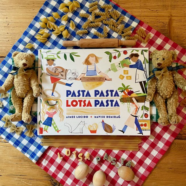 Italian pasta names make me happy. Joyful, lyrical, rhythmic — saying them is almost as good as eating them. Hungry? Time to put on a bib, grab a fork, and feast on Pasta Pasta Lotsa Pasta by Aimee Lucido and Mavisu Demirağ (Beach Lane Books, 2024).