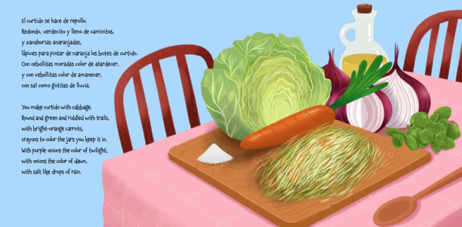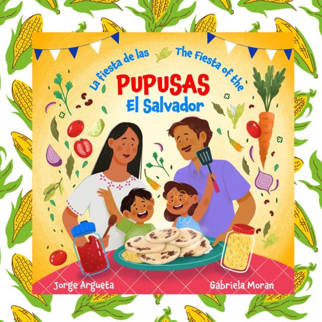Gabriela Morán’s colorful and cheery digital illustrations dance across the pages, capturing the energy and enthusiasm of hungry pupusa makers and eaters. Pictures of fresh cabbage, tomatoes, carrots, onions and stacks of pupusas being cooked and shared with others will certainly make readers curious to try them if they haven’t already done so.