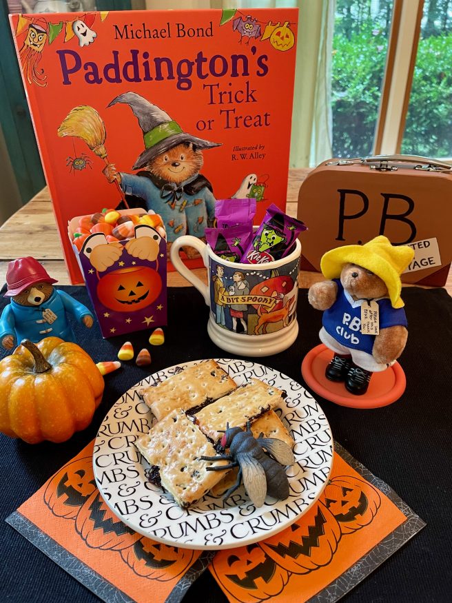 When he got back, Paddington helped Mrs Bird bake “squashed-fly” (Garibaldi) biscuits, since he couldn’t find any at the market, while Mrs Brown hollowed out pumpkins for lanterns.