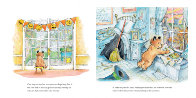 It all started Halloween morning, when Paddington came downstairs to breakfast carrying Mrs Bird’s best broom and wearing a trash bag draped over his duffle coat. He was working on his costume, since Jonathan and Judy had promised to take him trick-or-treating. Judy suggested they have a party afterwards, to which Paddington heartily agreed, as he’d never been to a Halloween party before.