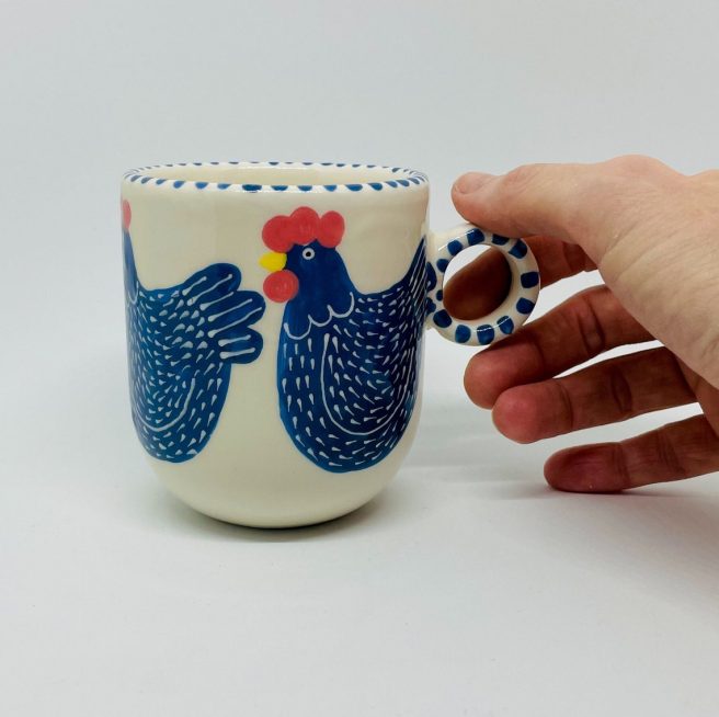 She lives in the Umbrian countryside with her husband and one dog, 2 cats, a horse and about 20 hens and roosters — and they all make appearances on her plates, cups, saucers, wall hangings, trinket holders, coasters, brooches and egg cups.