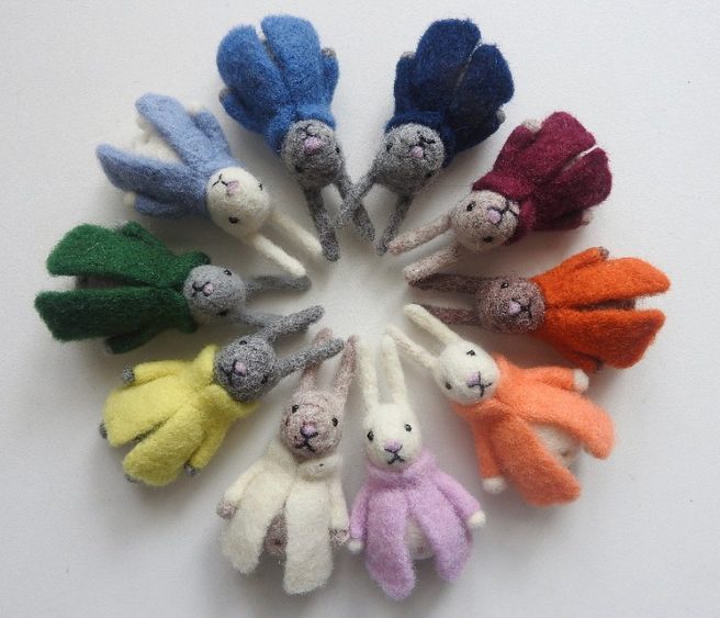 Each piece is handmade from 100% needle felted, eco friendly wool and is about 3 inches high. They come with their own passports specifying name, size, color, and favorite snack. You can also personalize them. Cute to wear on your lapel, bag or hat. 🙂