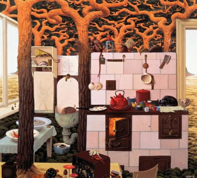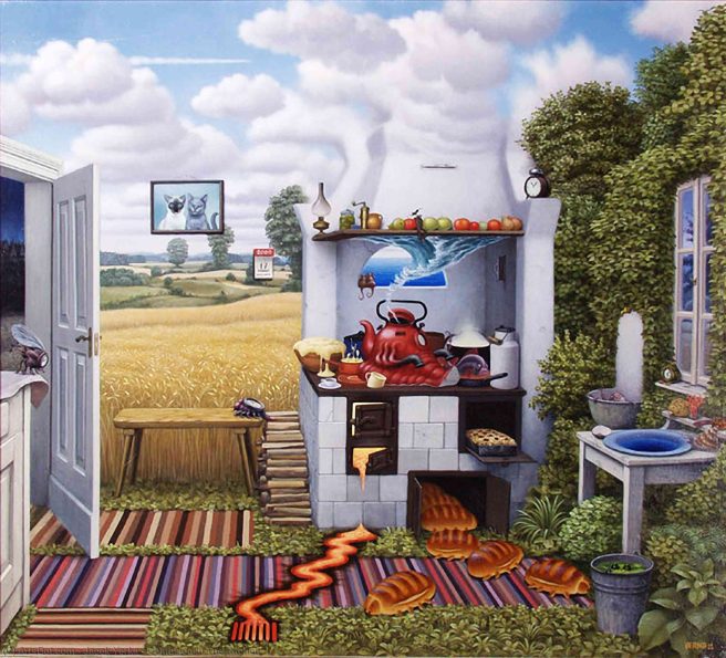 Still, I won’t be saying “no more nature poems” any time soon. I vote for a sensible compromise: nature in the kitchen (or a kitchen in nature?). Thanks to Polish surrealist painter Jacek Yerka, I can have both. 🙂