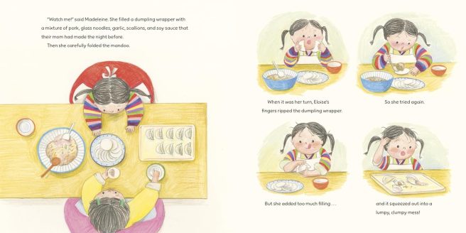 Hyewon Yum’s winsome colored pencil illustrations exude joy and love. The bond between the sisters is palpable, and I like how Yum captures their personalities with telling facial expressions and body language. Eloise is especially endearing with her pigtails, rosy cheeks, and little tongue licking her lips. You can’t help but root for her in the dumpling-wrapping sequence; she tries so hard only to produce a “lumpy, clumpy mess.” You can just feel her dismay as big sister takes over.