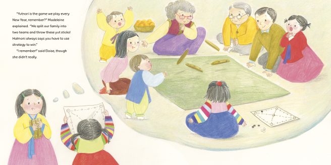 Young readers unfamiliar with Seollal will find the customs interesting and enjoy the warm, comforting feelings of family togetherness so integral to the celebration. Who would not want to feast on homemade dumplings and play a fun and lively game with relatives? Whatever they’re doing, Madeleine and Eloise enjoy it even more because they’re doing it together.