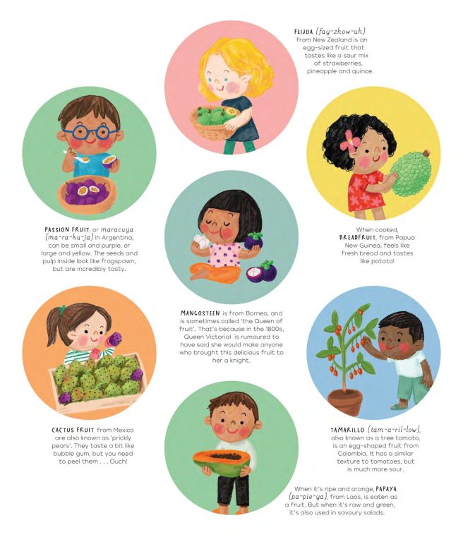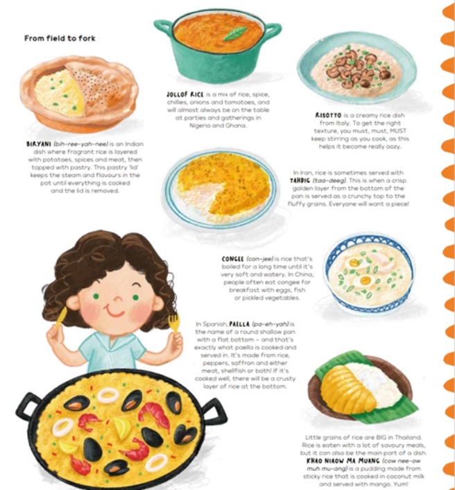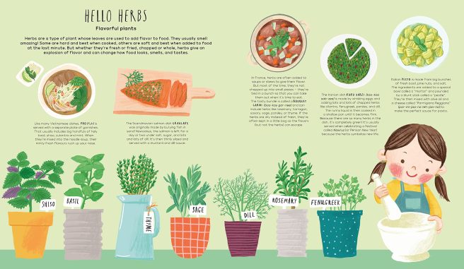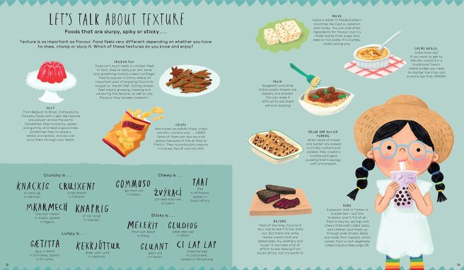 Budding linguists will appreciate the spreads showing how to say ‘delicious,’ ‘goodbye,’ ‘crunchy,’ ‘chewy,’ ‘happy eating,’ etc., in a variety of languages. Pronunciation guides for foreign dishes are also included, and food trivia buffs will have a field day with the tasty little nuggets sprinkled throughout.