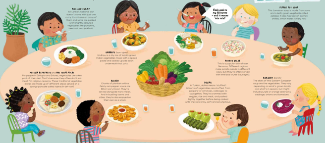 The mouthwatering menu contains 33 “courses” or topics, most featured on inventively designed, reader friendly double page spreads along with several single page spreads + sidebars. Friendly kids of multiple ethnicities are shown eating, serving, or interacting with various types of foods (interesting asides are conveyed via occasional speech bubbles).