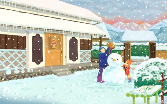 The final double page spread showing Papa and Chiyoko building a snowman together brings the magic of this heartwarming story full circle in a peaceful, satisfying way.