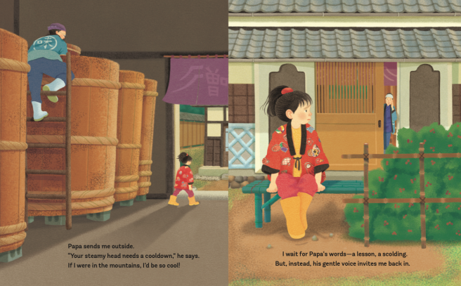 She wakens when she hears Papa walking to the misogura and follows him there to see if the rice is ready. “Not yet,” Papa says, reminding her that “magic takes time.” Papa needs to periodically turn the rice so it won’t overheat and kill the kōji.