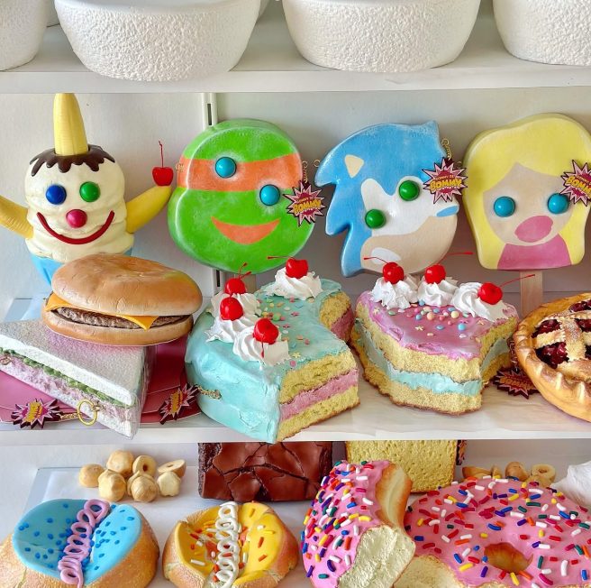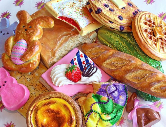 We were impressed by how she made everything by hand herself, creating unique, drool-worthy pieces. Now, 10 years later, she’s still a one-woman operation and continues to wow everyone with new designs that defy belief. Whether croissants, a stack of pancakes, a loaf of bread, layer cakes, s’mores, fish ‘n chips, cherry pies, burritos, tacos, TV dinners, fruit tarts, hot cross buns, on and on — all of her hand-painted clay-foam accessories look sooooo realistic and continue to turn heads.