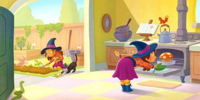 The fun continues with owl training, working on her magic-wand skills, brewing a bee-wing potion, then baking a toadstool cake. With a poof of her magic-wand, she even turns herself into a dragon!