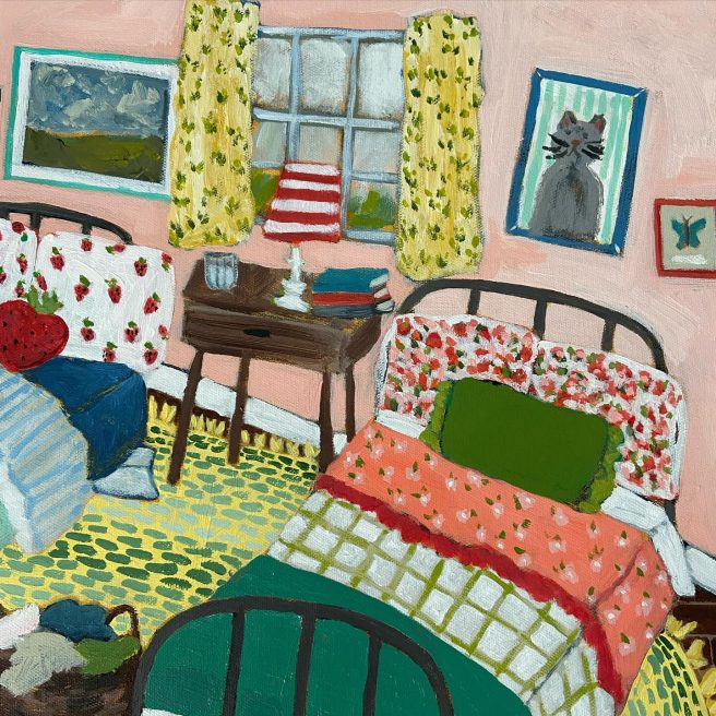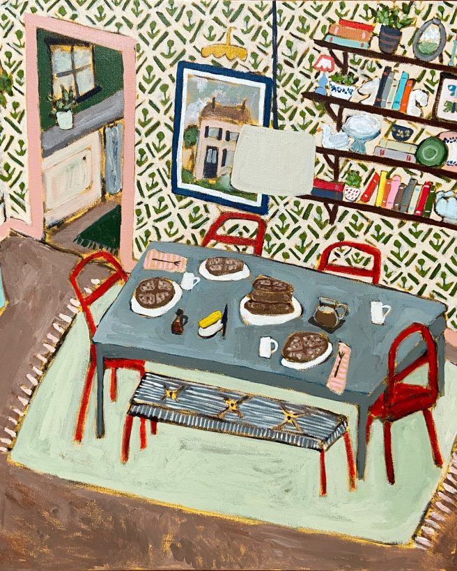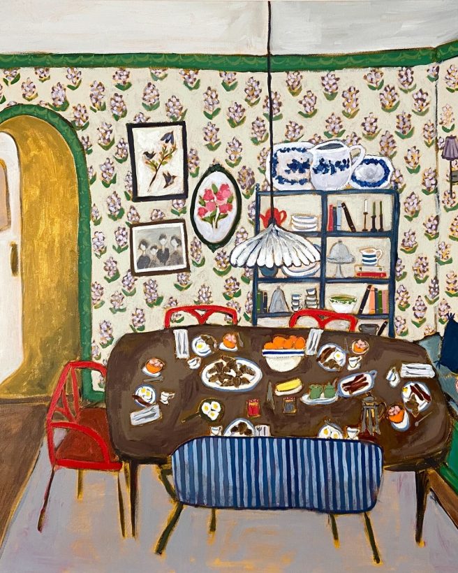 This piece immediately caught my eye as it speaks to my love of naive art and my special interest in interiors (especially kitchens and dining rooms). If there’s a table set with cute crockery, or vintage textiles and furnishings in a cozy room, I’m all in. I like the calm and comfort of quiet, domestic spaces and appreciate the joys of common experiences depicted with just the right touch of nostalgia.