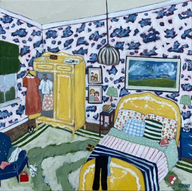 In 2015, Ginny closed her sewing business and started over as an “artist.” Since then, she’s continued to embrace the elements of whimsy and nostalgia which are now the hallmarks of her work. She enjoys celebrating simpler times, home life, ordinary places, heirloom objects and the beauty of everyday moments.
