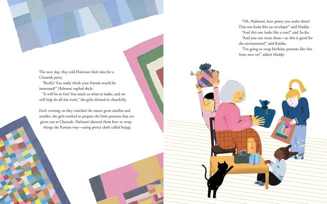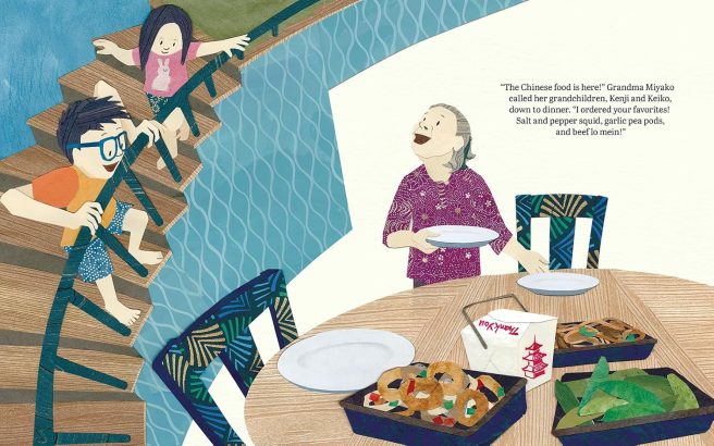 As the story opens, Grandma Miyako has ordered Chinese takeout for her grandchildren Kenji and Keiko. After they’ve feasted on their favorites — salt and pepper squid, garlic pea pods, and beef lo mein — she hands them their fortune cookies, mentioning that she knew who invented them.