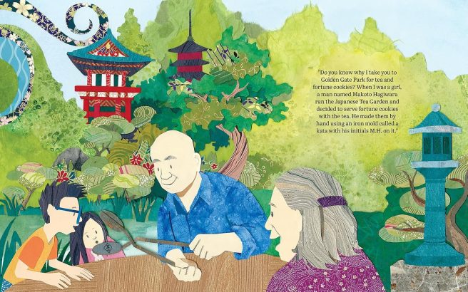 The kids are excited to hear more about that in the “long and twisty story” Grandma tells using her scrapbook. When she was a girl, Makoto Hagiwara, the man who ran the Japanese Tea Garden in Golden Gate Park, served tea with miso-flavored fortune cookies he made by hand using a kata (iron mold).