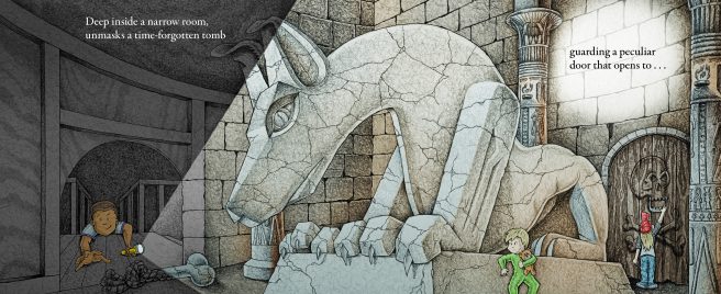 Koehler’s ingenious illustrations depict the dramatic transformations from real to imagined: a striped cat becomes a ferocious tiger, water trickling from a garden hose becomes a torrent of rushing water, the space beneath the deck is the long-forgotten tomb, the above-ground pool is the ocean.