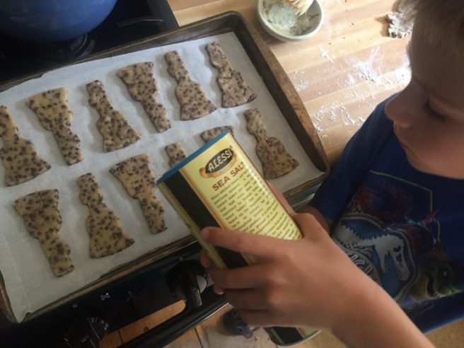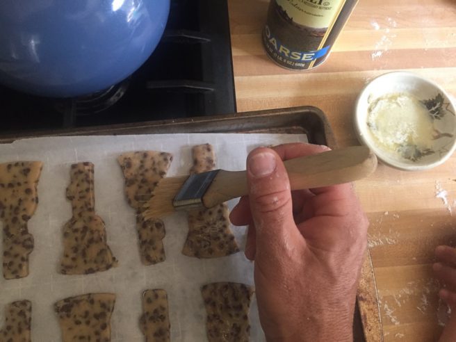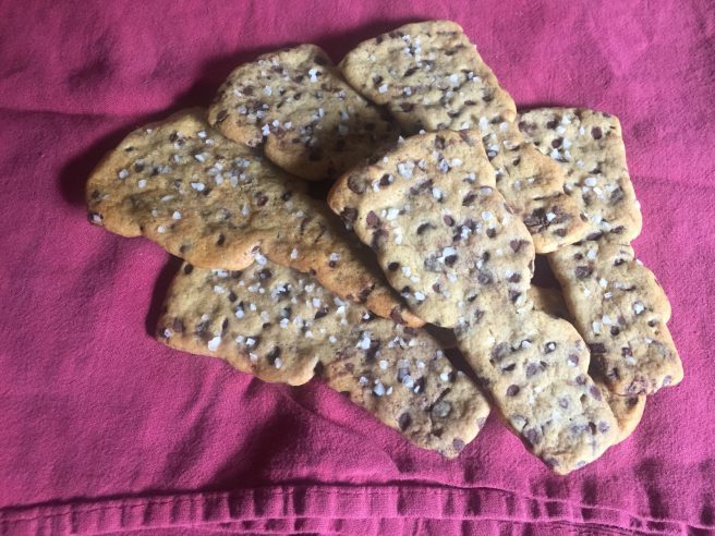 When ready to bake, heat oven to 350 F. Roll out dough on lightly floured surface to 1/8-inch (if in doubt, dough should be no thicker than the width of a chip), cut into shapes, and place 1-inch apart on ungreased cookie sheet. Be careful not to handle the dough too much, or the chips will start melting. Brush on the melted butter, then sprinkle with salt – but with not too heavy a hand! Bake until slightly browned: 6-7 minutes for softer cookies, 7-8 minutes if you prefer crispy. Let rest a few minutes, then transfer to a rack to cool.