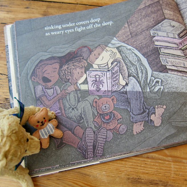 Each page turn heightens the suspense as the trio is ultimately rescued via hot air balloon. Once safe and sound back in their tree house, they resume reading together, the flashlight illuminating a stack of books that inspired their adventure.