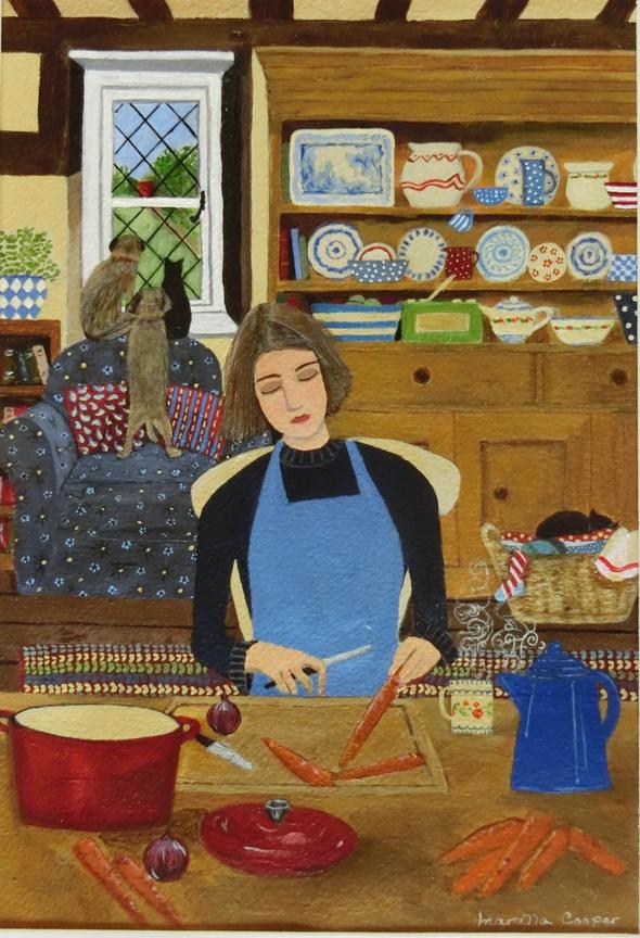 Inspired by walks along the beach, she featured coastal landscapes, cottages, beach huts, boats, and seagulls in her earlier paintings. In recent years, her main focus has been people and humor (“unreal characters in sometimes strange pursuits”).
