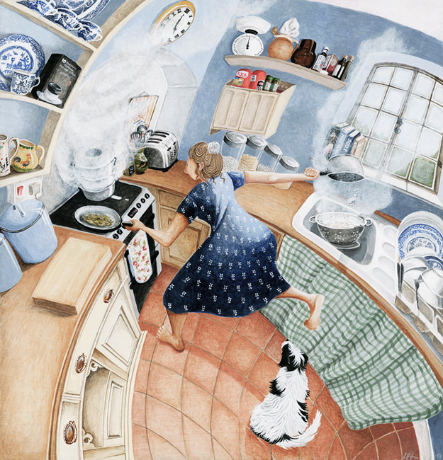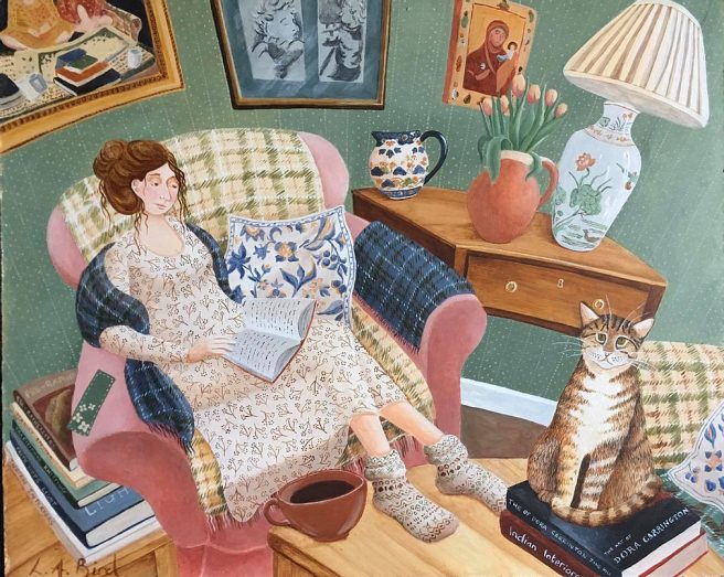 Self taught UK artist Lucy Almey Bird grew up in rural Somerset, and likes to paint domestic scenes from everyday life. I love the “kinder, gentler” tone of her pictures, many of which show people reading and relaxing, enjoying the fresh air, or cooking up something delicious in the kitchen.