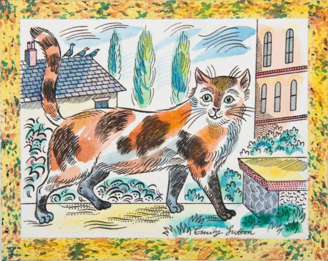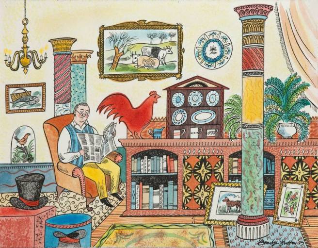 Her birdie friends appear in her work, along with other domestic animals, garden flora, and winsome figures from halcyon days, who seem to thrive on the simple, everyday pleasures of rural life.