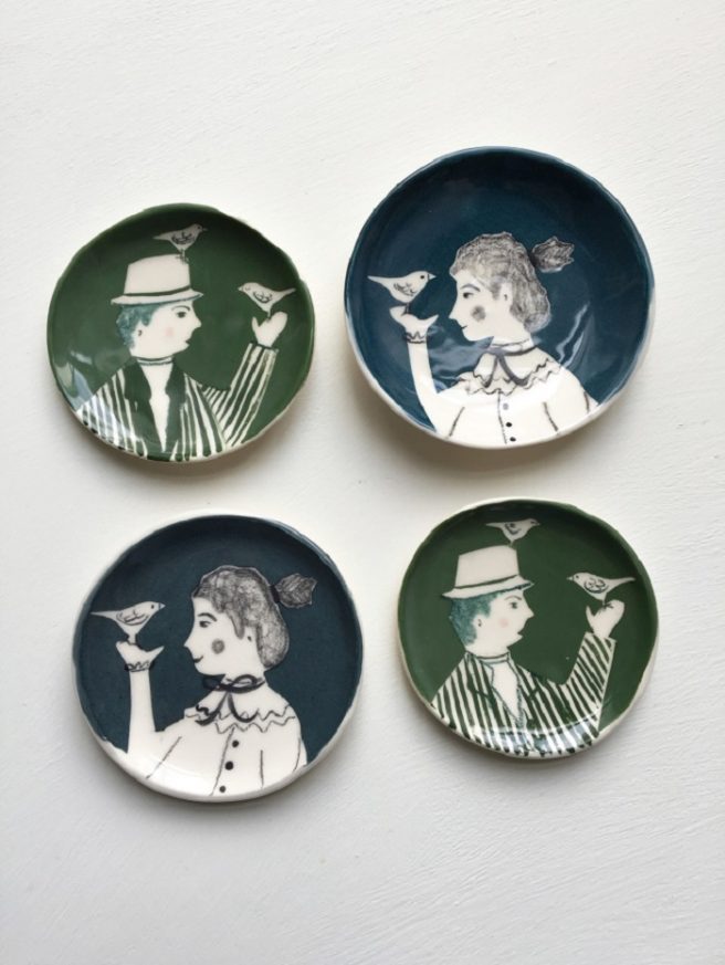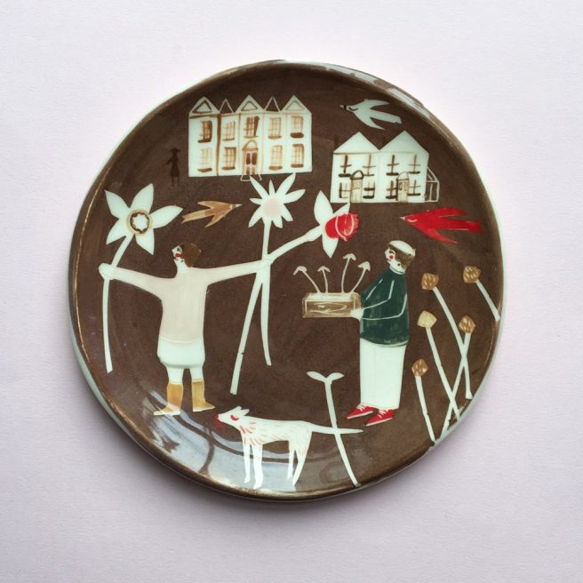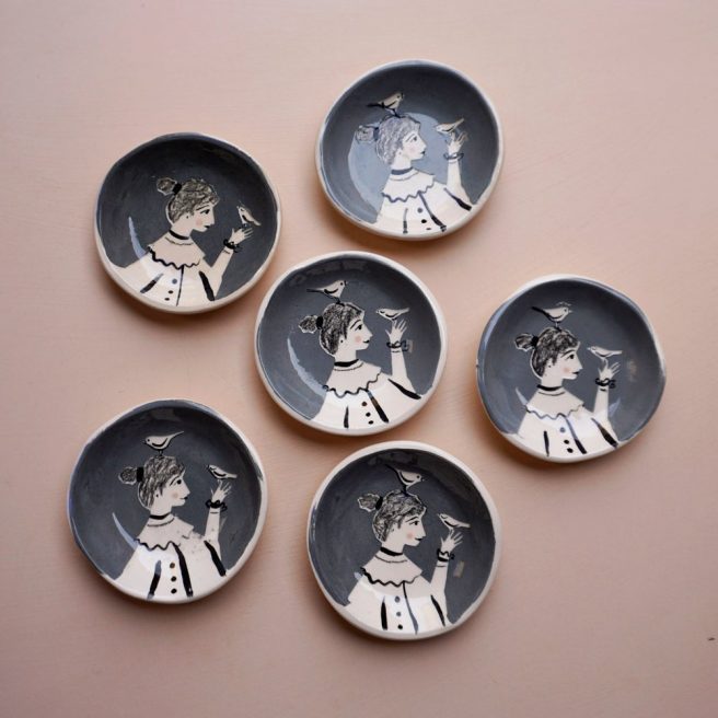 I hand paint all of my decoration. I paper-cut a lot of my illustrations and then use the paper resist technique on raw ceramic, painting upon them with slip and peeling away the paper, then working back into the resist shapes with glazes and oxide details. It’s quite a labour-intensive process; with each piece I make taking a lot of time. But the process is important to my work and I wouldn’t enjoy it as much if it were straightforward.