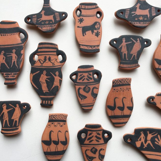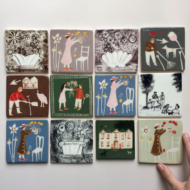 Polly likes browsing antique shops and museums, wandering around market towns, and discovering gardens and buildings with a rich history of craft. Some of her ceramic pieces do look like things you’d find in a museum, and it’s fun to study the scenes she’s painted to ponder the stories taking place.