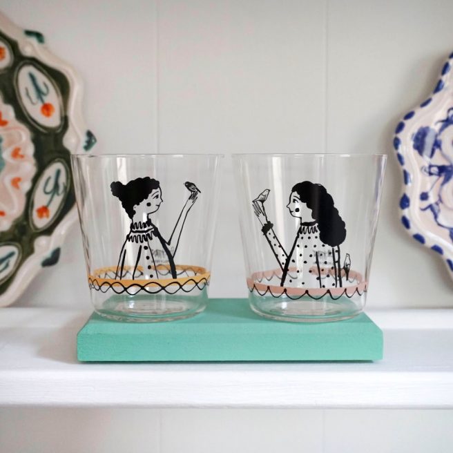 Her charming folkloric style is detailed and delicate, inspired by history, local places and childhood stories. Her ceramic vases and platters, which are modern takes on traditional shapes, are all handmade and bisque fired. Her vessels are dipped in a tin glaze before the designs are painted on with oxides and pigments.