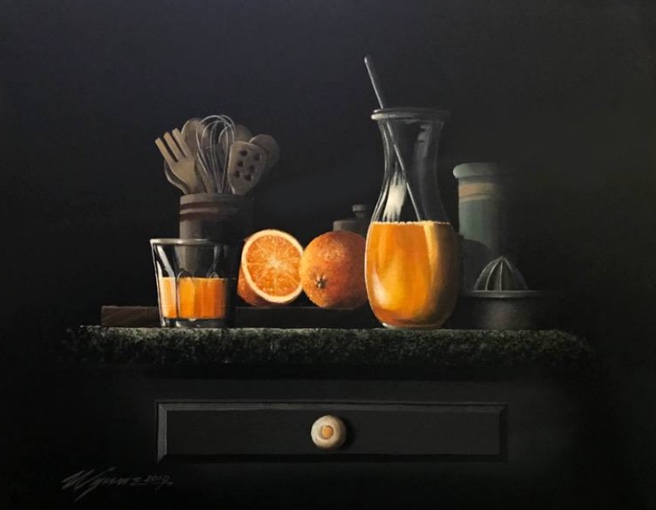 He is groggy in the morning. I wake up renewed and ready for the day. Ready, first thing, to squeeze oranges for him. He can't begin, doesn't want to begin, without a glass of fresh juice brought to him in bed. A simple act for me. For him, a big ahh, quenching, invigorating.