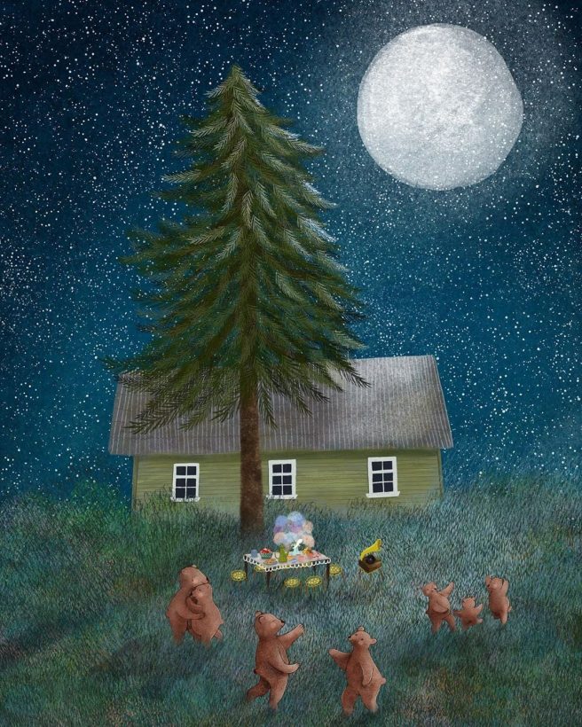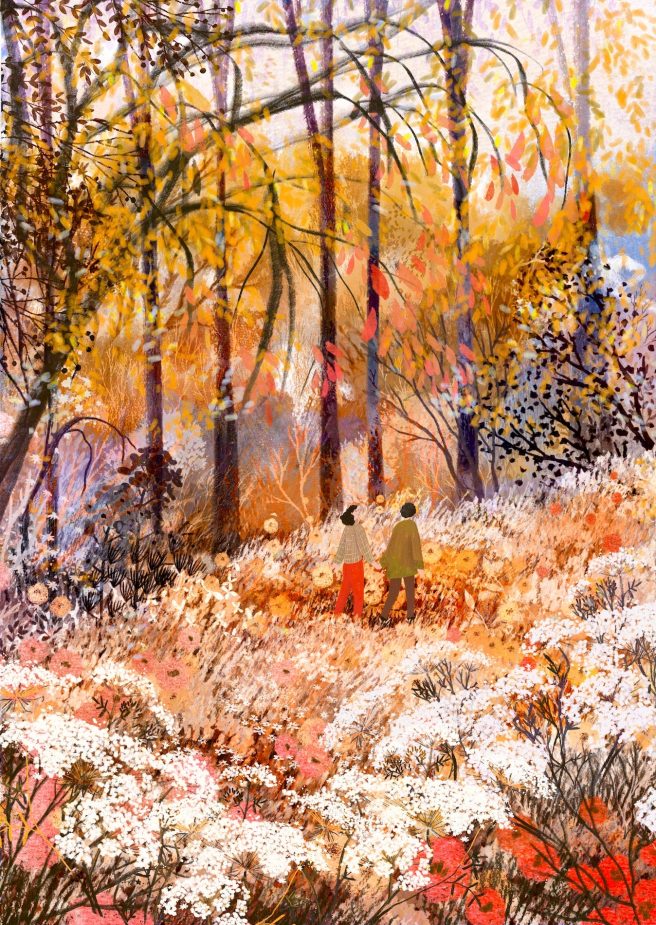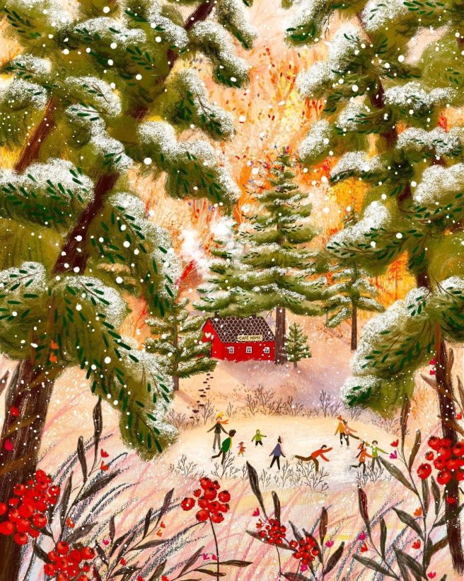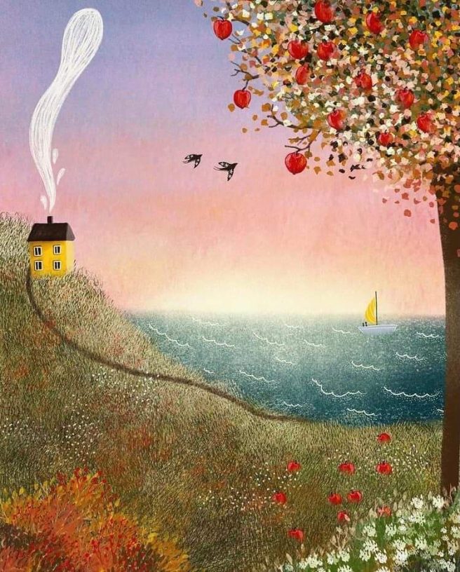 Just so many lovely designs! Besides prints, she sells t-shirts, notebooks, greeting cards, mugs, tote bags, etc., and she’s recently added fabrics and gift wrap. Something for everyone. For much more, visit her Official Website, The Wheatfield, her Facebook and Instagram.