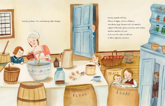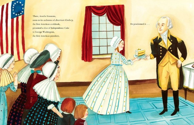 In my story, Amelia’s reputation as a cook results in the town asking her to bake a special cake for George Washington at his 1789 inauguration. Amelia makes thirteen: one for each of the original colonies, which are carefully packed in wagons and driven off to New York to be pronounced “delicious” by the first president. (As the author’s note declares: this is entirely a confection!)