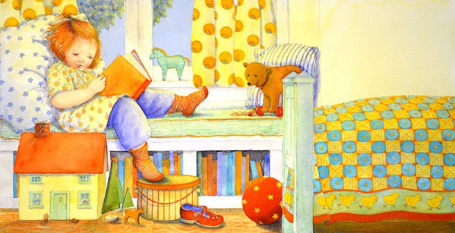 Ashley’s lush, color-saturated gouache and pastel illustrations bring Janna’s spare rhyming text to vivid, glorious life. Her dramatic use of scale in several double page spreads creates a sense of intimacy and introspection, while charming details such as the squirrel stealing a tomato, the girl blissfully reclining in a wheelbarrow, and her endearing notebook doodles keep us turning the pages. The majestic tree, with its thick sturdy trunk, generous branches teeming with wildlife, and foliage rendered in soft, fluid daubs of green is soothing and inviting.