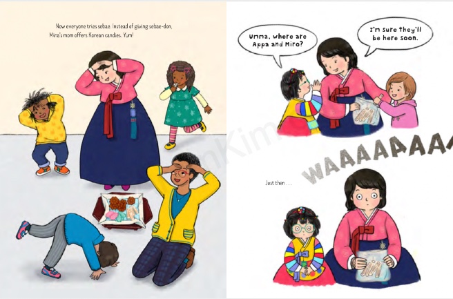 In Let’s Celebrate Korean New Year! (Random House BFYR, 2024), we meet Madeleine and Eloise, two sisters getting ready for their Lunar New Year party. As the big sister, Madeleine takes the lead in briefing Eloise about party attire, food, and games.