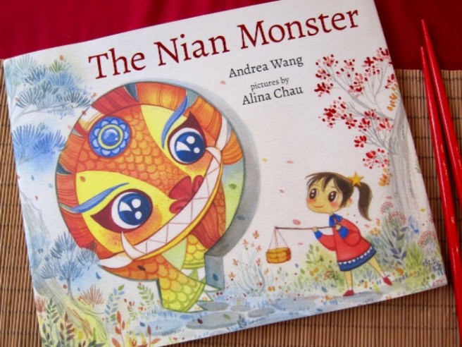 In The Nian Monster by Andrea Wang and Alina Chau (Albert Whitman, 2016), young Xingling wonders why all the Chinese New Year decorations are red, so her grandmother (Po Po) tells her all about the Nian Monster — a ferocious creature with “jaws as wide as caverns” and “teeth sharper than swords,” who would get so hungry every Spring, he left his home in the mountains to consume entire villages.