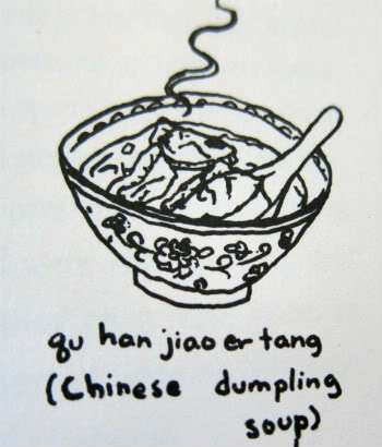 It was so cold that when a villager joked that his breath froze into pieces of ice in the air, all believed him because even if the cold did not freeze one’s breath, it really did freeze people’s ears. The doctor was kept busy during the winters treating frostbitten ears. He knew that people with frostbite needed warmth to heal, so he began to make a remedy that would warm peoples’ insides as well as their outsides. He cooked meat with warming herbs and finely chopped it. Then he wrapped it in thinly rolled dough and boiled the pieces in soup with more herbs. When the mixture was finished, he called it “soup that takes away the cold,” or “qu han jiao er tang.” He then served it to his frostbitten patients, who not only healed quickly, but enjoyed the soup so much that they continued to eat it.