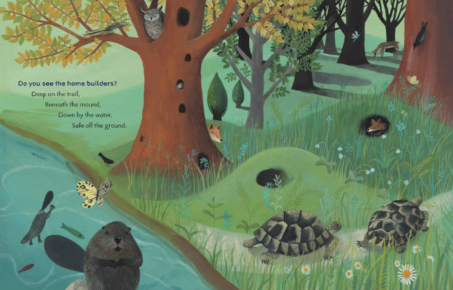 What makes this book extra special is that on each page there is a special “Press Here” button, so readers can hear the sounds of birds, bugs, and frogs, along with the rustling of leaves and the rummaging of squirrels! There are ten wonderful sounds in all, including opening music, so it feels like we’re right there with them! 🙂