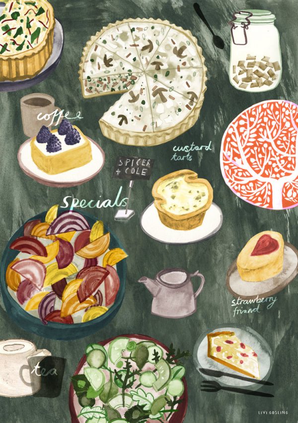 Must admit I first discovered Livi’s work because of her food illustrations. Somehow, delightful drawings of pies, veggies, salads and sangria always catch my eye.