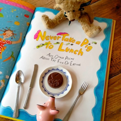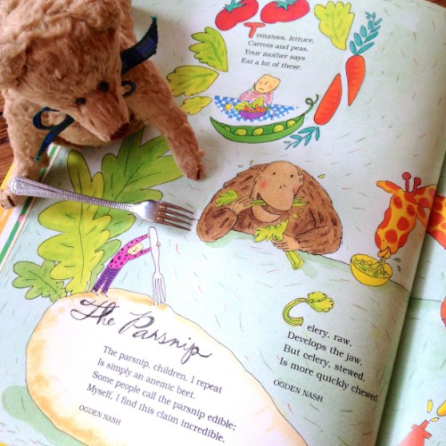 Don’t get me wrong. It’s not all about food. Though there’s a respectable smorgasbord of kooky cuisine, kids will find oodles of other subjects infused with Prelutsky’s signature whackadoodle humor to get them giggling and nodding their heads in recognition — poems about faking illness to skip school, lamenting homework, growing light bulbs in a garden, being allergic to your pets, being forgetful or a chronic complainer, even cautionary quips about squeezing electric eels or being carried away by giant bubble gum (there’s a giant Easter Bunny too).