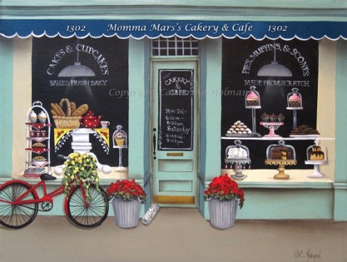 5. It’s never too early to think about holiday gifts, especially those you’d like to have personalized. What about a lovely folk art print by Catherine Holman? Ever dream of having your own cupcake or tea shoppe? Maybe you have a friend who’d love to see her name on the awning of this cute and cozy cakery and cafe.