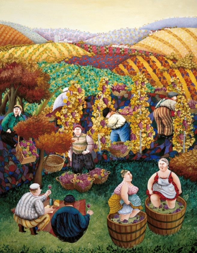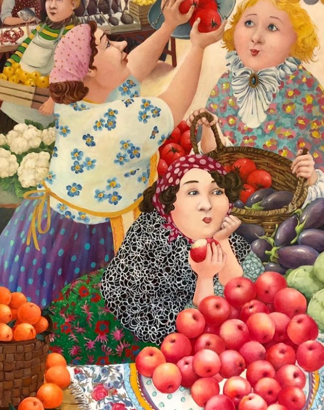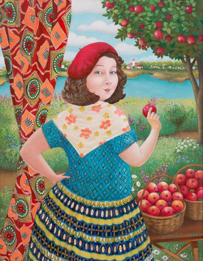 Elena Narkevich’s beautiful acrylic on canvas naïve paintings are characterized by vibrant colors, inventive compositions, precise details, and a strong narrative component.