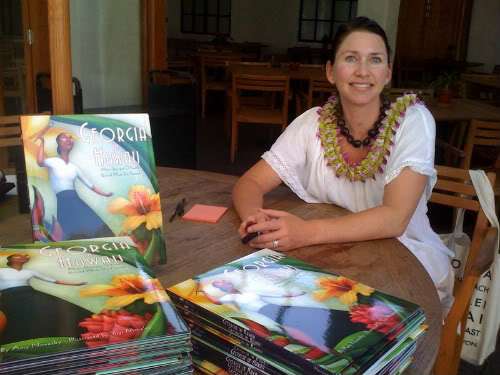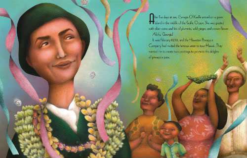 Amy and illustrator Yuyi Morales have done a brilliant job of presenting this little-known chapter in Georgia’s life, a rare instance in which she allowed her art to be used for commercial purposes. Despite the pineapple problem, Georgia was fascinated and intoxicated by Hawaii’s unique and varied land and seascapes — lush flora, interesting lava formations, mountains, gorges, waterfalls, beaches, caves, streams, and of course, abundance of tropical blossoms. She thrived in this natural paradise, as she explored remote areas in Hana, Maui, and strolled along the black sand beaches on the Big Island with her trained eye fixed on unspoiled vistas of singular beauty.